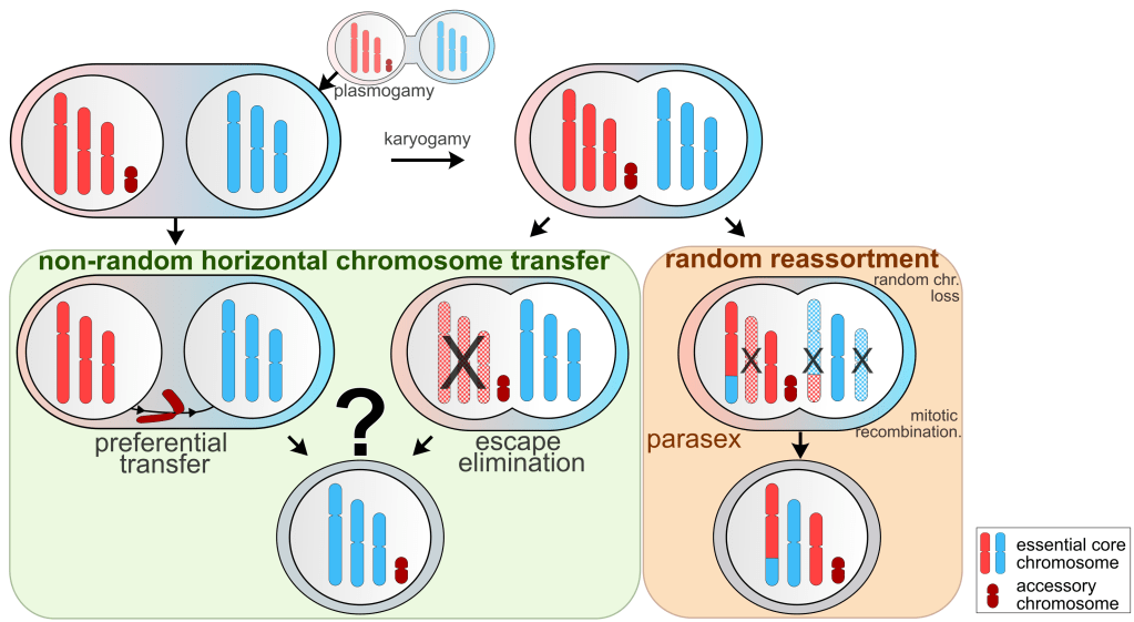 Accessory chromosomes are dispensable, linear eukaryotic chromosomes present in only a subset of individuals within a species. In fungi, they often carry hundreds of transcriptionally active genes and can influence host specificity, virulence, and fitness. In some pathogens, these chromosomes are capable of horizontal transfer within and between species, thereby altering recipient phenotypes such as host range and fitness.